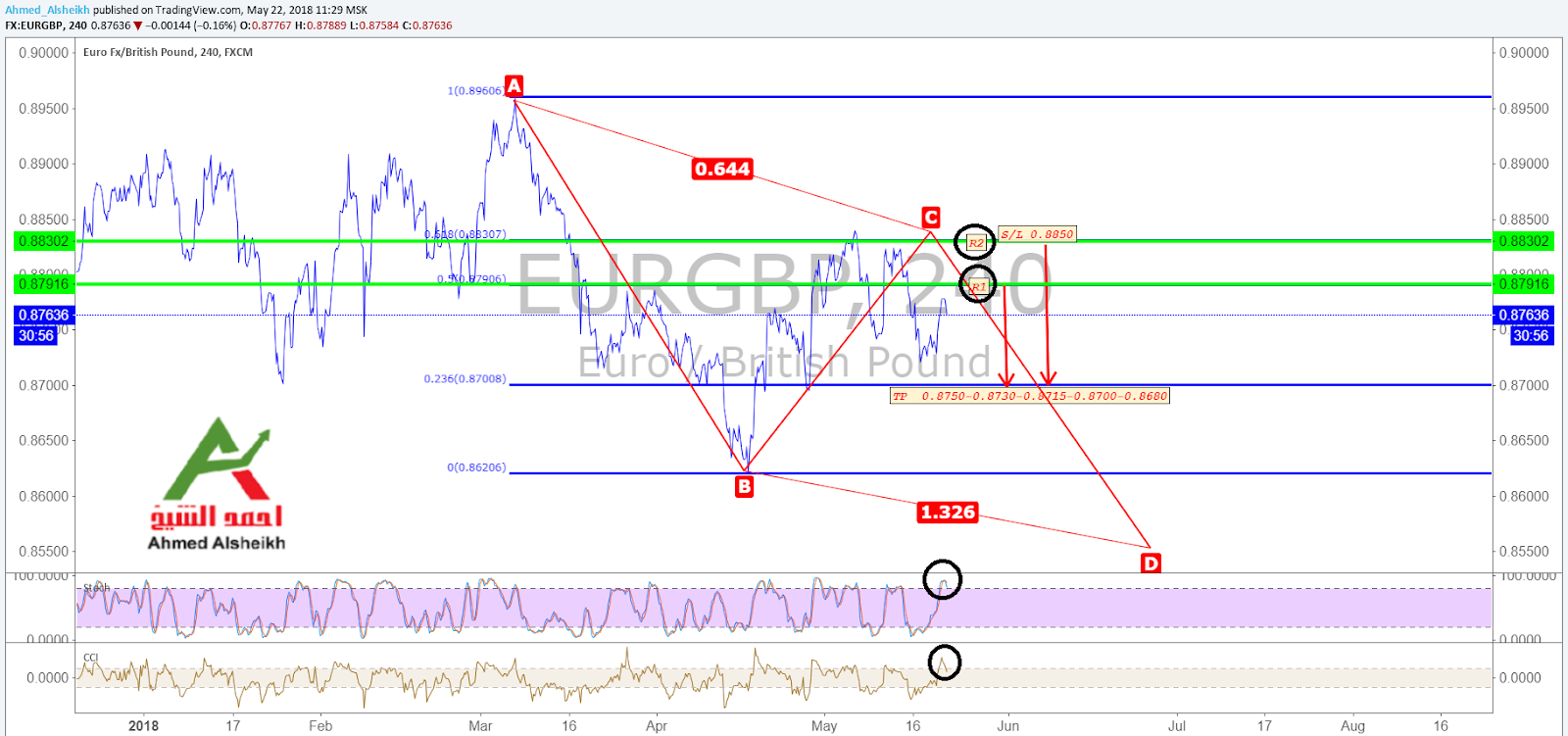 5- فرص بيع قائمة على الزوج كونه اسفل خط مقاومه متمثلة ب 50-61.8 فيبو وهنا تمثل هذه النقطة الارتدادية قوية جدا عند نقطة C