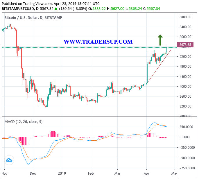 وقد أظهرت العديد من المؤشرات الفنية ، بما في ذلك المؤشرات طويلة المدى ، مثل ال (MACD) ومتوسط الحركة الأسية (EMA) ، انعكاس الاتجاه عندما تجاوز سعر عملة البيتكوين لأول مرة 5000 دولار ، مما زاد من قوة الدفع للبيتكوين والتى قادت باقى العملات المشفرة لتحقيق مكاسب أقوى. بعد تلك المكاسب زادت التوقعات بأحتمالية أختبار الزوج لقمة ال 6000 دولار على المدى القصير فى وقت لاحق من شهر أبريل.